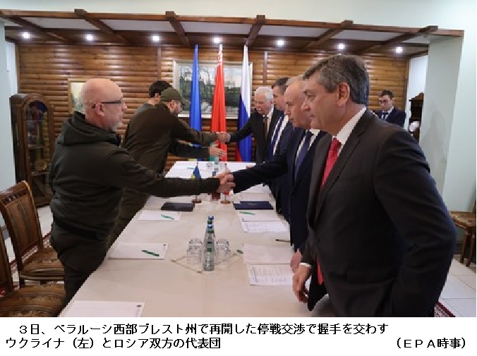 初の停戦対話が終了、継続探る 開催中もロシアは攻撃 ―― ロシア軍によるウクライナ侵攻で、両国の代表団は2月28日、ベラルーシ南東部のウクライナとの国境地帯で停戦を巡る対話を実施した。双方の立場は隔たりが大きいが、停戦の実現に向けた課題を詳細に話し合った。終了後、近く2回目の対話を行い、なお歩み寄りを探る意向を示した。対話中も各地で激しい攻防が続いたとみられ、収束への道筋は見えない。米国防総省高官は28日、ロシア軍が数日間で首都キエフの包囲を狙うとの見通しを示した。
