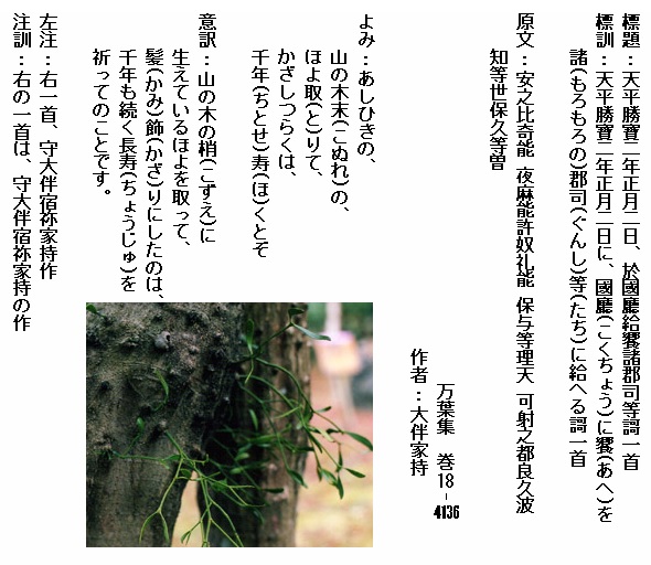 よみ:あしひきの 八峯(やつを)の上の 樛(つが)の木の いや継々(つぎつぎ)に 松し根の 絶ゆることなく あをによし 奈良の都に 万代(よろづよ)に 国知らさむと やすみしし 吾(わ)が大皇(おほきみ)の 神ながら 思ほしめして 豊(とよ)し宴(ほあかり) 見(め)す今日(けふ)は 物部(もののふ)の 八十(やそ)伴(とも)の男(を)の 島山に 明(あか)る橘 うずに刺し 紐解き放けて 千年(ちとせ)寿(ほ)き 寿(ほ)き響(とよ)もし ゑらゑらに 仕へまつるを 見るが貴さ