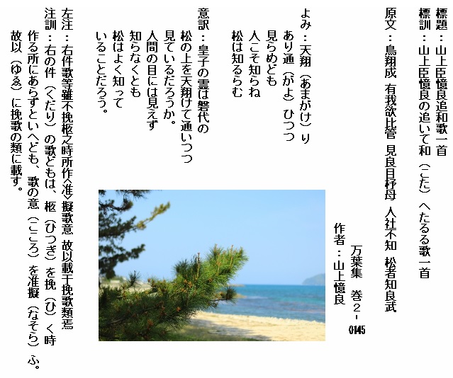 憶良がこれらの歌を詠んだのは天平五年三月一日のことで、前年に憶良は筑前の守の任を終えて奈良の都に帰京していたようです。そんな奈良の都の憶良の屋敷を訪ねて来た丹比広成に贈った歌ですが、憶良が歌に込めた言霊のおかげかこの年の四月に出航した広成はその後、唐での任を終えて荒れた帰路の航海に苦慮しながらも無事大和に帰って来ることが出来たようです。