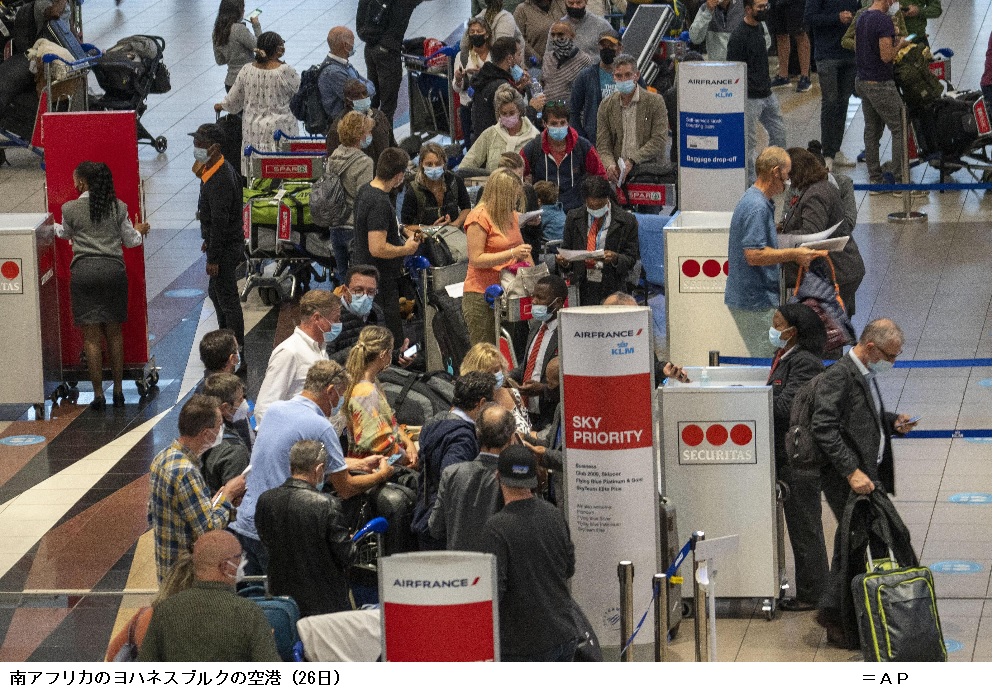 英国で感染者が見つかったのは同国の南部と中部だが、2件は「関係している」(ジャビド保健相)という。ロイター通信によると、27日にはドイツとチェコでも同型の感染が疑われる事例が出ている。オランダでは26日に南アフリカから到着した2機の航空機に搭乗した乗客約600人のうち、61人に陽性反応があり、オミクロン型の感染か調べている。
