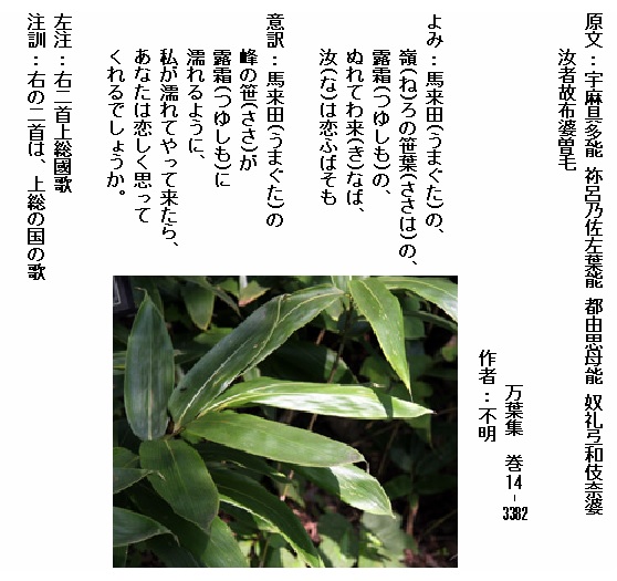 巻7-1276:池の辺の小槻の下の小竹な刈りそねそれをだに君が形見に見つつ偲はむ