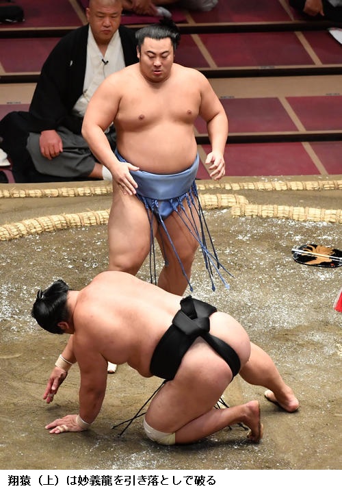 ▽妙義龍に翔猿は、翔猿が引き落とし。妙義龍は5日目で初黒星です。