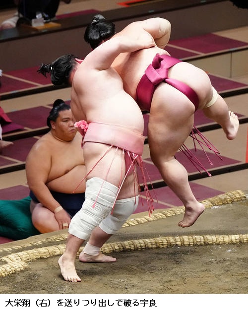 ▽宇良に大栄翔は、宇良が送りつり出しで勝ちました。