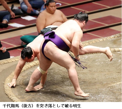 ▽新関脇 明生に琴ノ若は、明生が下手出し投げ。