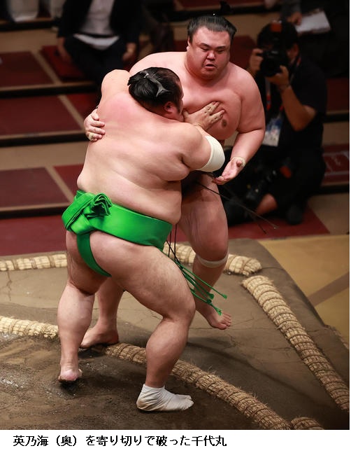 前頭16枚目で勝ち越した千代丸は「あとがなかったので、きょう勝ち越したいというのはあった。一番でも多く勝って少しでも上に上がりたいのであしたまで集中して頑張りたい」と気を引き締めていました。