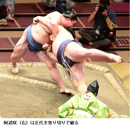 ☆阿武咲「中に入られたので良かった。押し込まれたときは焦ったけど、冷静さもあって良かった。(終盤戦で大関戦)やることは変わらないので、しっかり自分の相撲を取りきるだけです。(優勝争いは)今日は今日なので、明日また集中して頑張ります」