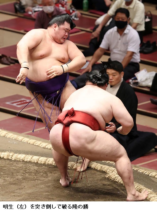 ▽新関脇の明生に隆の勝は、隆の勝が押し倒し。