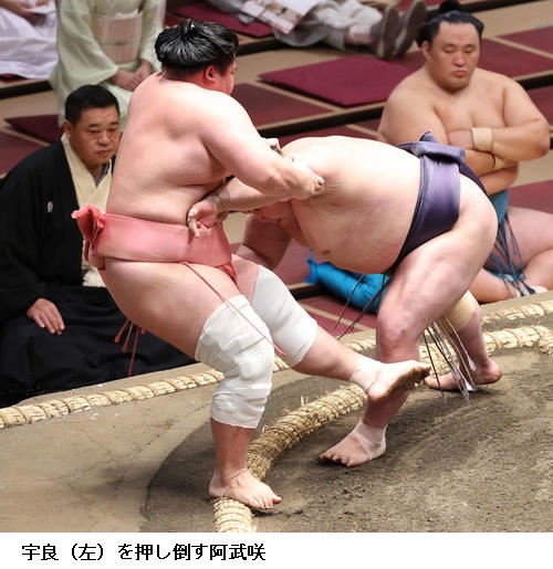 ▽宇良に阿武咲は、阿武咲が押し倒し。