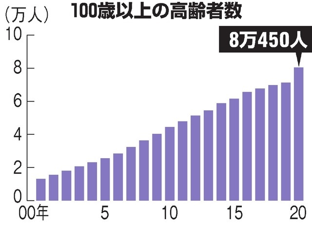 100歳以上が8万人突破 急激な伸び、総人口の何%? ―― 国内の100歳以上の高齢者の数は、「老人の日」の15日時点で8万450人と、初めて8万人を超えた。このうち女性は7万975人と、全体の約88%を占めた。厚生労働省が発表した。