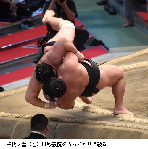 ▽妙義龍に千代ノ皇は、行司軍配差し違えで、千代ノ皇がうっちゃり。