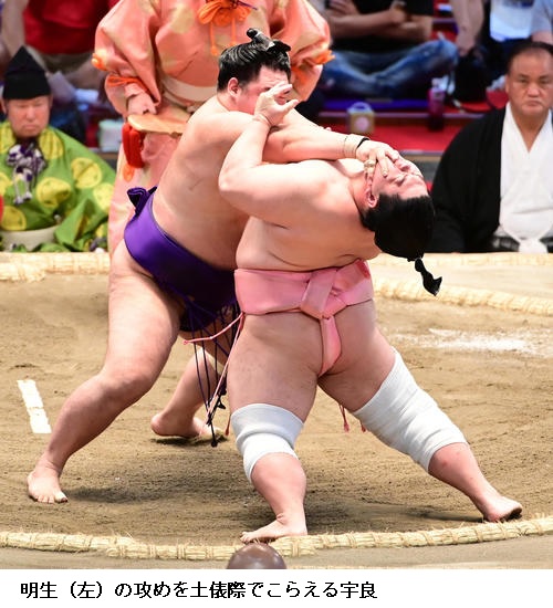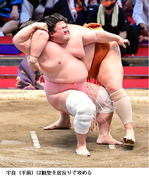 ☆宇良 (相手の霧馬山は)ほぼ同期で、教習所で一番多く稽古した相手。(霧馬山の)体も大きくなっていて、自信はなかったけど力は出し切って良かった。当時のことを思い出しましたね。(勝ち越しに向けて)また一番頑張りたい。