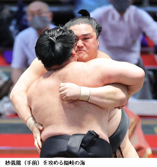 ▽英乃海に妙義龍は、行司軍配差し違えで英乃海がはたき込み。妙義龍は負け越しました。