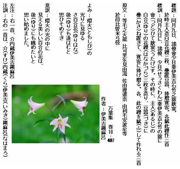 巻18-4087:灯火の光りに見ゆるさ百合花ゆりも逢はむと思ひそめてき