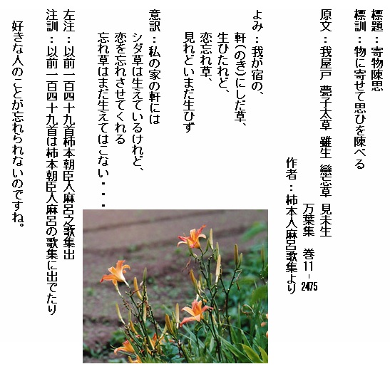 巻12-3062:忘れ草垣もしみみに植ゑたれど醜の醜草なほ恋ひにけり