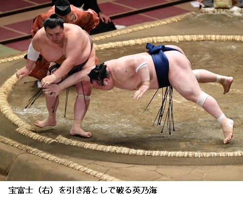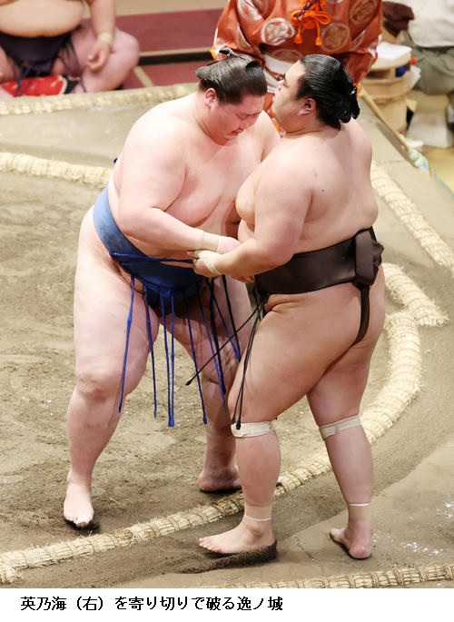 ▽英乃海に妙義龍は、英乃海が寄り倒し。