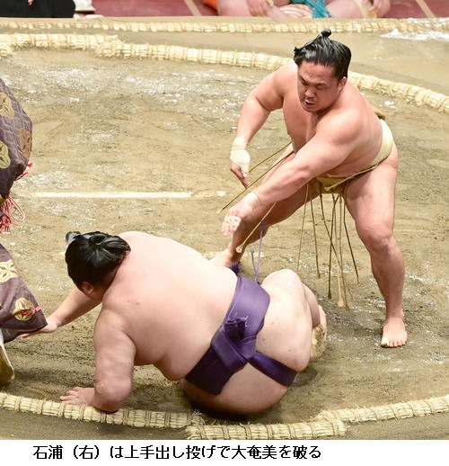 ●石浦 しっかり(相手の圧力を)止めて相撲を取ろうと思っていたけど、受け止められなかったのは自分の力不足。いなしとか横の動きに強い相手だが、相手に押されて相手のペースで取られてしまった。あと4日、気持ちを切らさずに1日一番大事にやっていきたい。