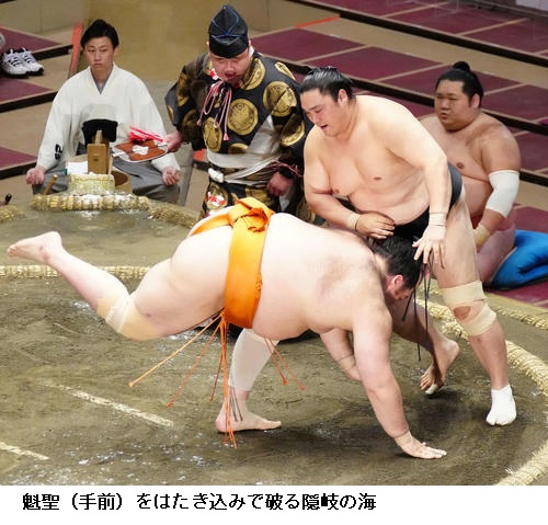 ▽大奄美に隠岐の海は、隠岐の海が寄り切りで勝ちました。
