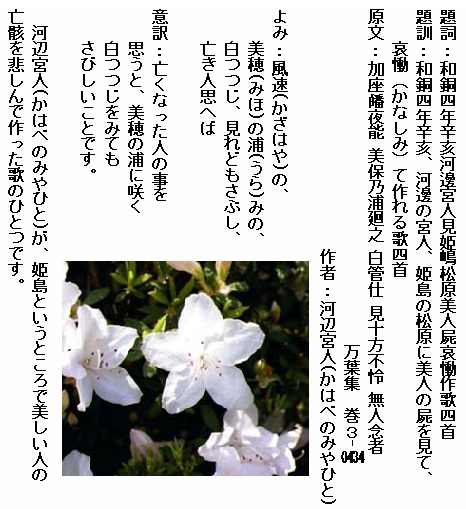 巻3-0434: 風早の美穂の浦廻の白つつじ見れども寂しなき人思へば