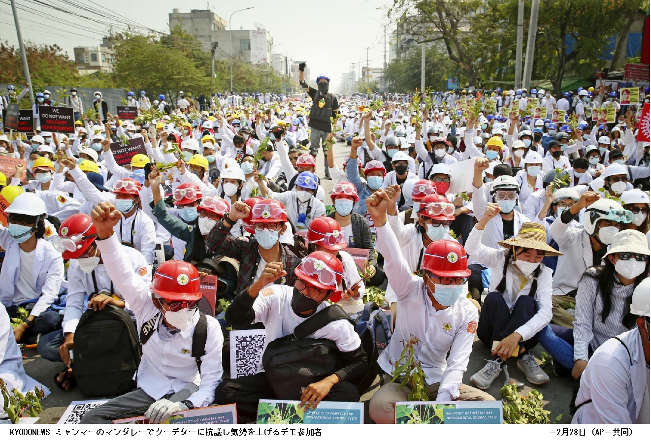 多数の死者が出たことで国軍に対する内外の批判が高まるのは必至。同事務所は「デモ参加者に対する暴力を強く非難する」との声明を発表した。 【共同通信社 2021/02/28 23:16】