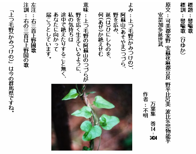 巻16-3834: 梨棗黍に粟つぎ延ふ葛の後も逢はむと葵花咲く
