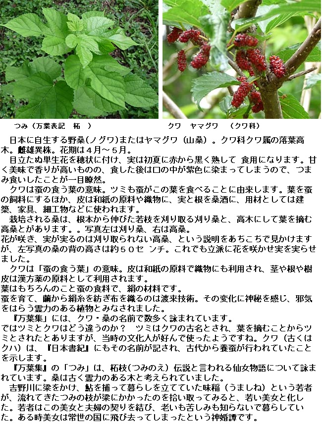 柘(つみ)は、野桑(のぐわ)/山桑(やまぐわ)のこととされています。野生の桑で、クワ科クワ属の落葉高木です。桑は4月頃から花をつけ、6月頃から赤い実をつけます。実は、夏になると黒く熟して食べられるようになります。
