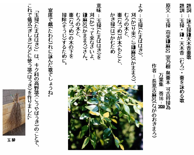 巻16-3830: 玉掃刈り来鎌麻呂むろの木と棗が本とかき掃かむため