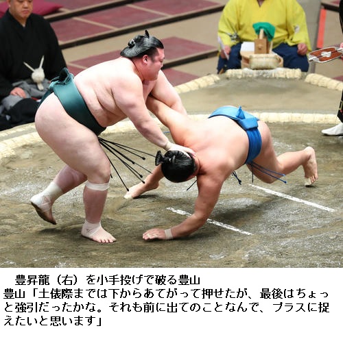豊山は勝って3勝1敗とし「前半戦でこれだけ勝っているのは久々なので何とも言えない。目標は勝ち越しなので、あと五番勝てるように1日1日必死にやっていきたい」と話していました。