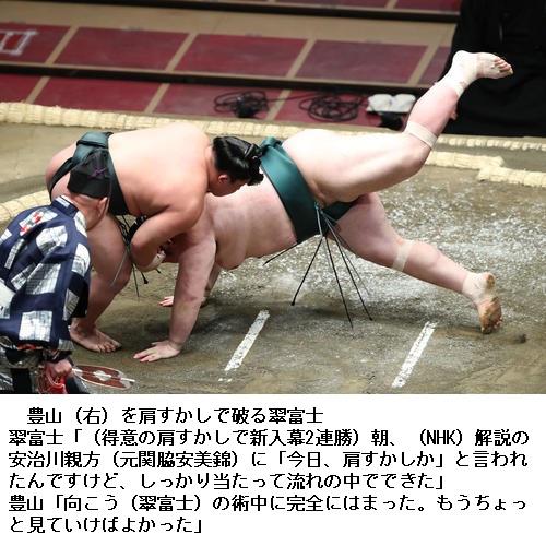 ▽新入幕の翠富士に豊山は翠富士が肩透かし。