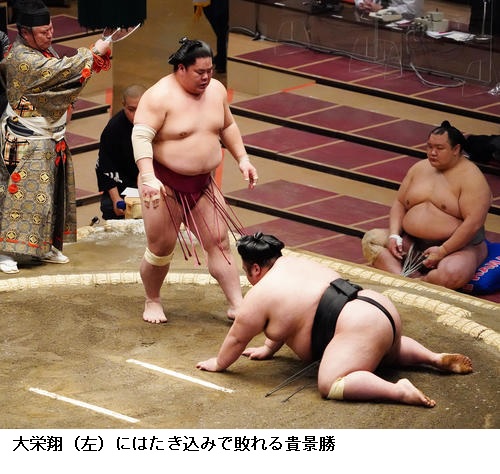 ▽前頭筆頭の大栄翔に輝は大栄翔がとったりで中日に勝ち越しました。