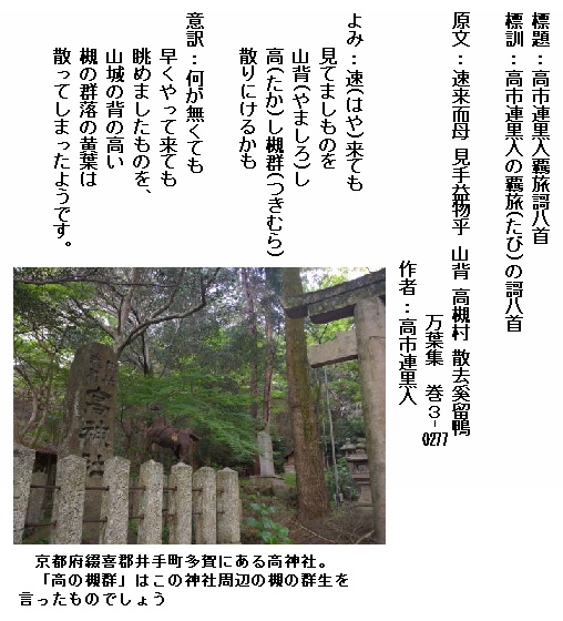 巻3-0277:早来ても見てましものを山背の高の槻群散りにけるかも