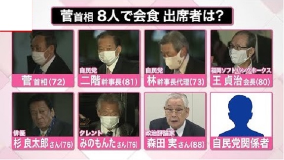 14日の夜、都内のステーキ店で会食した菅総理。同席したのは自民党の二階幹事長(81)、福岡ソフトバンクホークスの王貞治会長(80)、俳優の杉良太郎さん(76)ら8人ほど。70歳を超える人たちの忘年会でした。