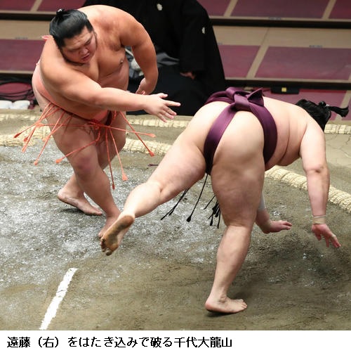 ▽千代大龍に遠藤は、千代大龍がはたき込みで勝ち越しました。