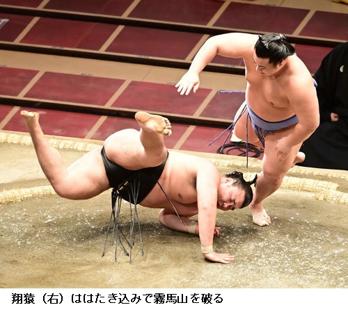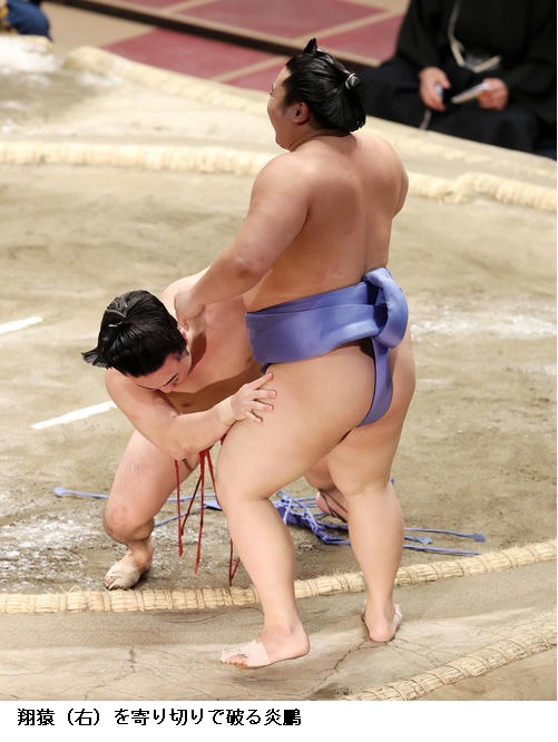 翔猿は大関経験者の高安に「蹴返し(けかえし)」を決めて5勝目を挙げ「ふと、体が動いた。少し元気を出して相撲を取ろうと思っていた。大関経験者に勝ってうれしい。残りが大事なので」と前向きでした。