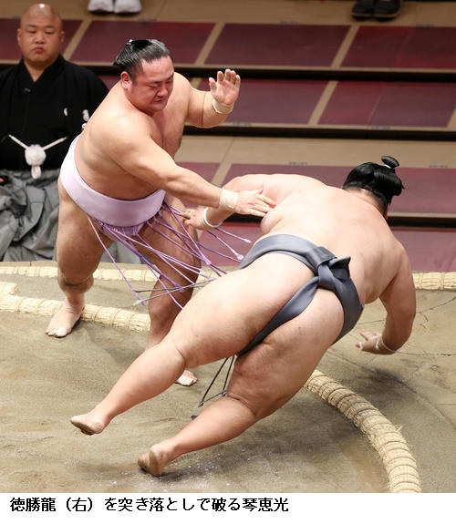 ▽琴恵光に徳勝龍は、琴恵光が突き落としで4連勝。