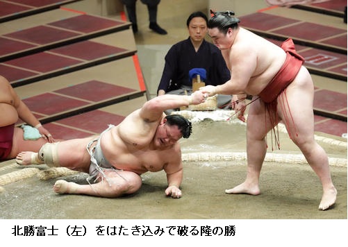 ▽新関脇 隆の勝に玉鷲は、隆の勝が寄り切り。