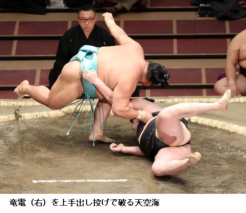 ▽十両の翠富士に新入幕の天空海は、天空海がはたき込みで勝って幕内で初白星を挙げました。