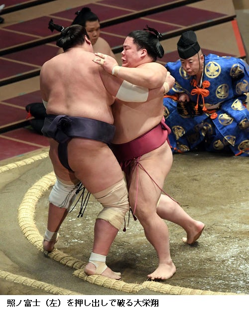 ▽照ノ富士に妙義龍は照ノ富士がきめ出しで9勝目。妙義龍は負け越しました。