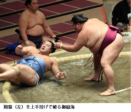▽妙義龍に翔猿は、翔猿が突き落としで勝って初白星を挙げました。