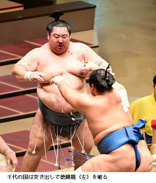 千代の国は勝ち越しを決め「うれしい。後悔のないように全力を出しきろうと思った。今場所はあまり褒められた内容がないので、その中でも勝ちにつながるのはいいことだ。残り3日、1日一番、しっかり集中して前に出る相撲を取りたい」と話していました。