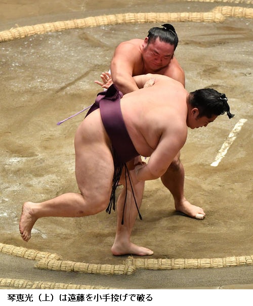 ▽遠藤に琴恵光は琴恵光が小手投げ。