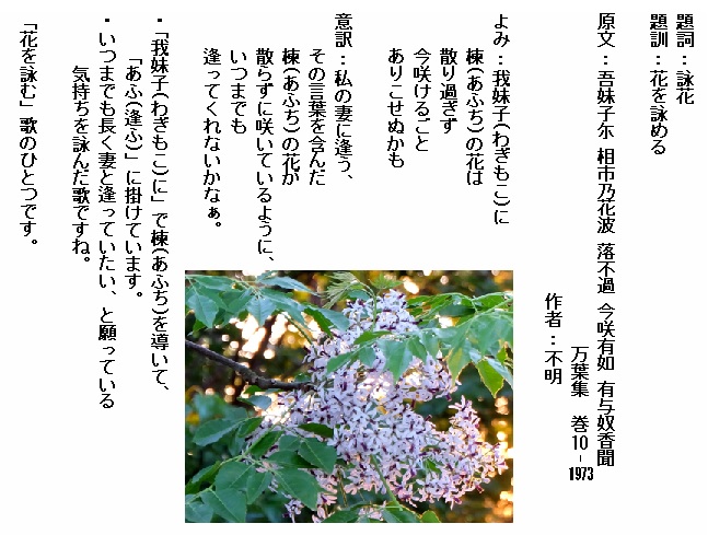 巻10-1973: 我妹子に楝の花は散り過ぎず今咲けるごとありこせぬかも
