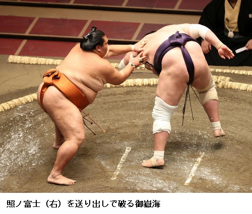 ▽関脇・御嶽海に照ノ富士は、御嶽海が送り出しで勝って2連勝。