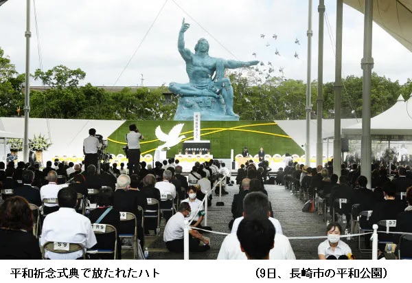長崎市によると、式典には被爆者や遺族、68カ国の代表ら約500人が出席。新型コロナ対策として例年の10分の1程度に縮小した。参列者は原爆投下時刻の午前11時2分に黙とうし、犠牲者の冥福を祈った。この1年間で新たに3406人の原爆死没者の名簿が奉安され、長崎原爆の死没者は計18万5982人になった。