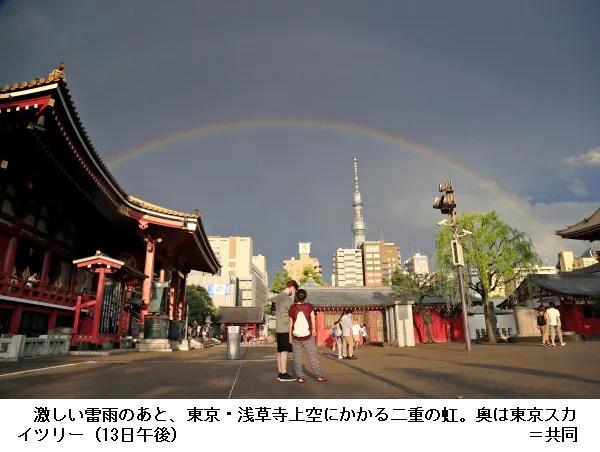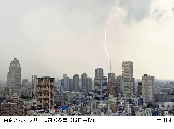 スカイツリーに落雷 続く猛暑、局地的に雨 ―― 日本列島は13日も高気圧に覆われて晴れ、最高気温が35度以上の猛暑日となった地域が相次いだ。午後は暖かく湿った空気や気温上昇などの影響で大気の状態が安定せず、関東では局地的に雨雲が発生、東京スカイツリー(東京・墨田)には雷が落ちた。