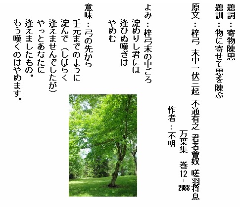 巻12-2988: 梓弓末の中ごろ淀めりし君には逢ひぬ嘆きはやめむ