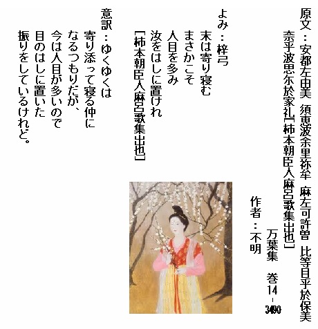 巻14-3490: 梓弓末は寄り寝むまさかこそ人目を多み汝をはしに置けれ