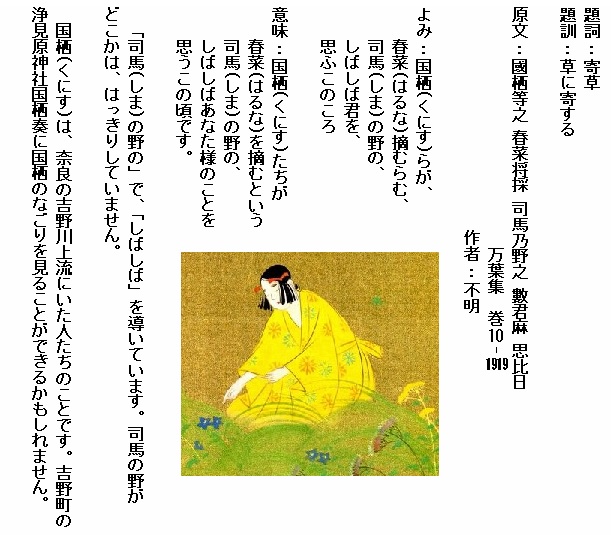 巻10-1919: 国栖らが春菜摘むらむ司馬の野のしばしば君を思ふこのころ