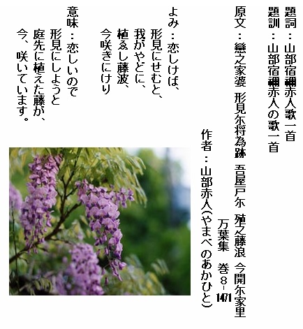 巻8-1471: 恋しけば形見にせむと我がやどに植ゑし藤波今咲きにけり