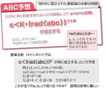 ABC予想は、整数の足し算と掛け算の関係にまつわる予想で、一九八五年に欧州の二人の数学者が提唱した。共通の約数(公約数)を持たない自然数A、Bと、これを足した数Cが登場する。A、B、Cを素因数分解(素数の掛け算に分解)し、出てきた素数を一回ずつ掛けた数Dがほとんどの場合、Cより大きいとする。この正しさを証明するのは極めて難しいとされていた。