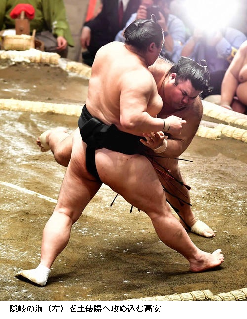 ▽大関復帰を目指す高安に隠岐の海は、高安が押し出し。